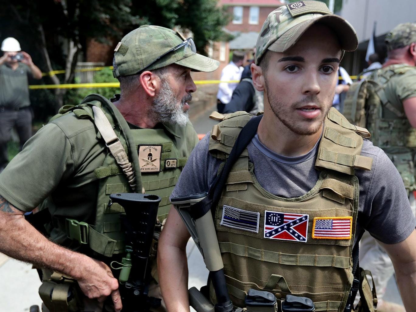 White nationalists, neo-Nazis and members of the 'alt-right' with body armor and combat weapons evacuate comrades who were pepper sprayed after the 'Unite the Right' rally was declared a unlawful gathering by Virginia State Police. Militia members marched through the city earlier in the day, armed with assault rifles. Getty ImagesΔΙΑΒΆΣΤΕ ΠΕΡΙΣΣΌΤΕΡΑ