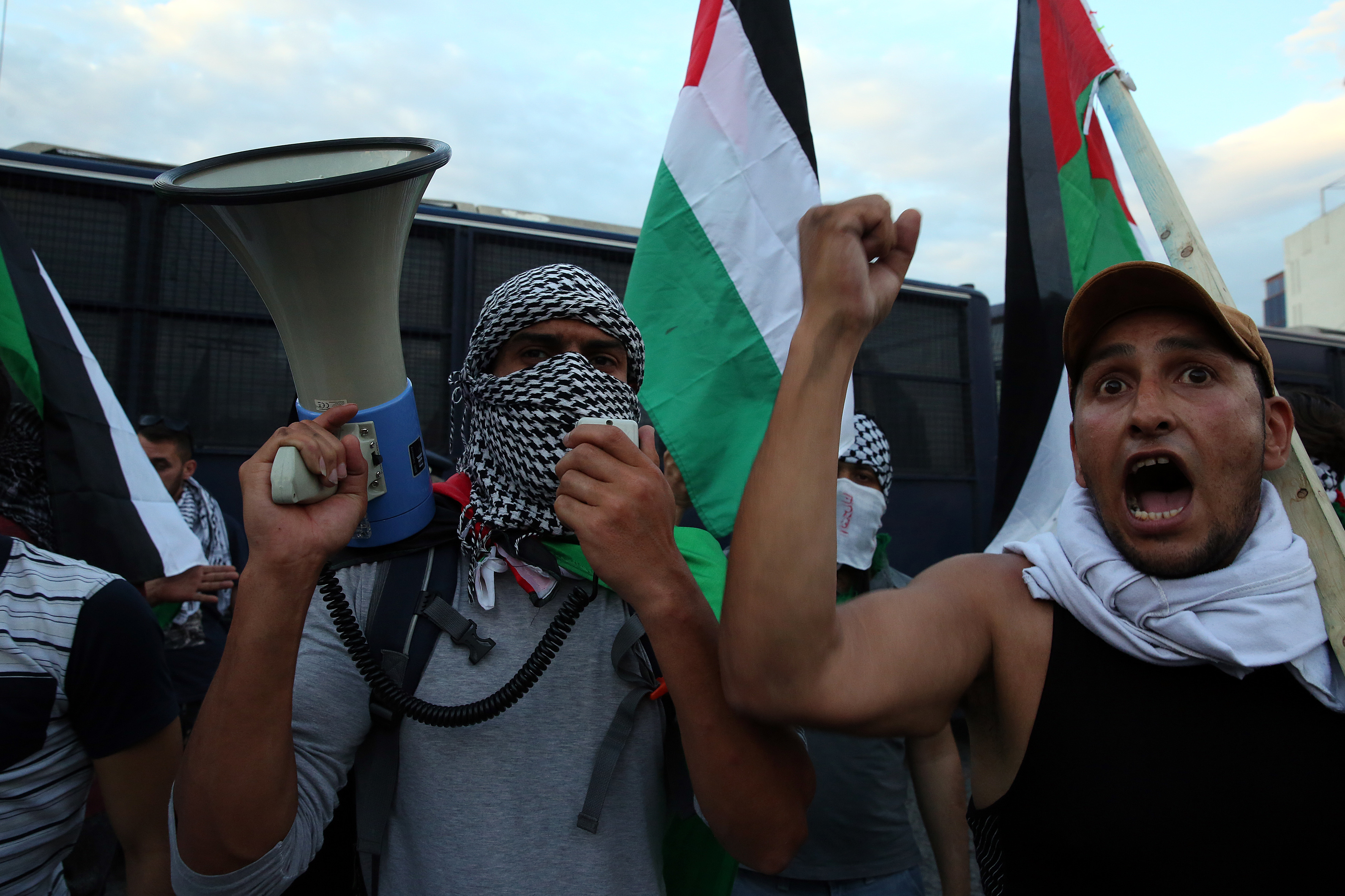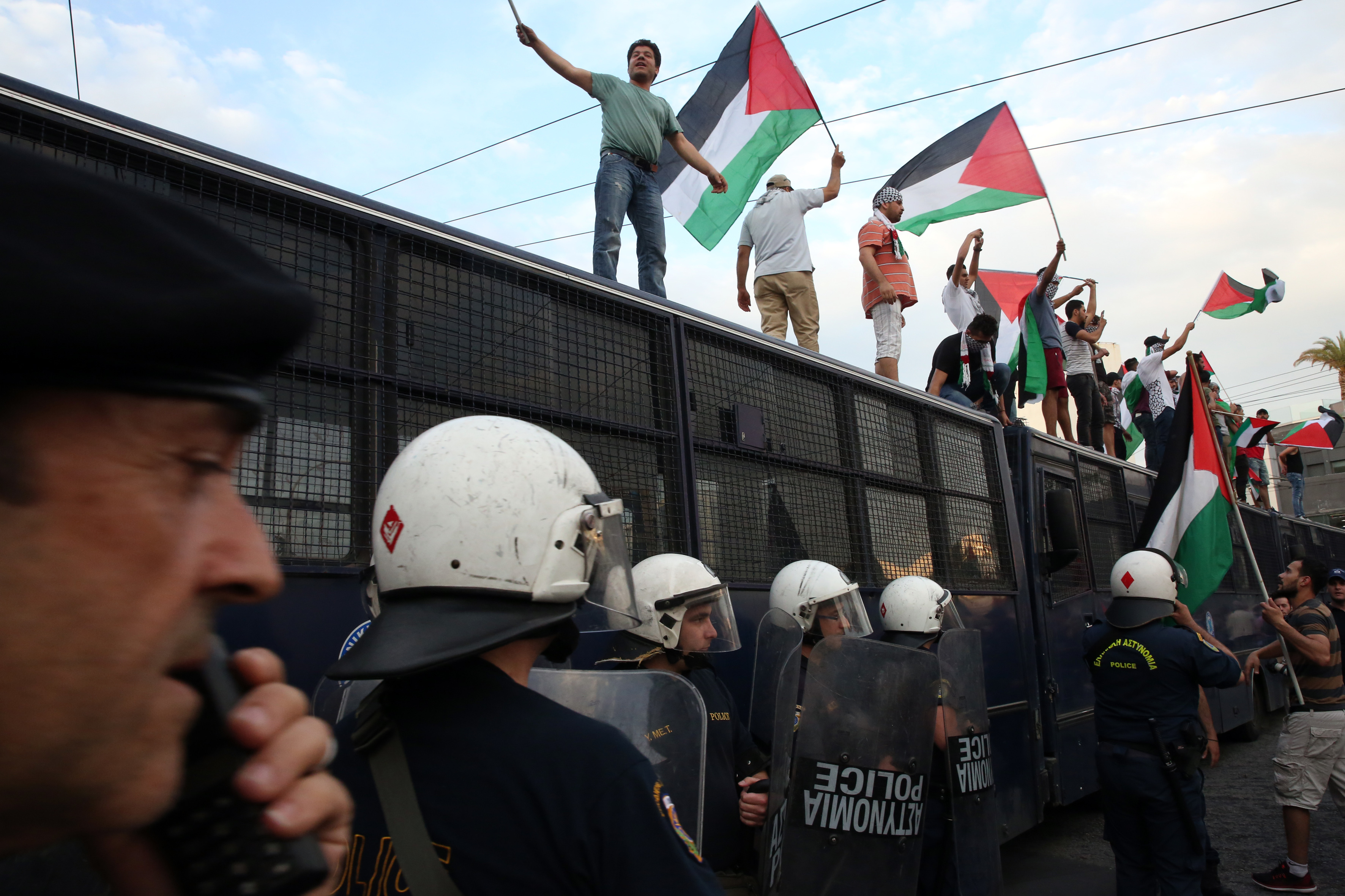 Οταν η πορεία έφτασε στην Πρεσβεία του Ισραήλ, Παλαιστίνιοι διαδηλωτές ανέβηκαν στις κλούβες της αστυνομίας, φώναξαν συνθήματα στη γλώσσα τους και έκαψαν μια σημαία του Ισραήλ, παρουσία περίπου χιλίων διαδηλωτών, ενώ το κυρίαρχο σύνθημα ήταν «λευτεριά στην Παλαιστίνη».
