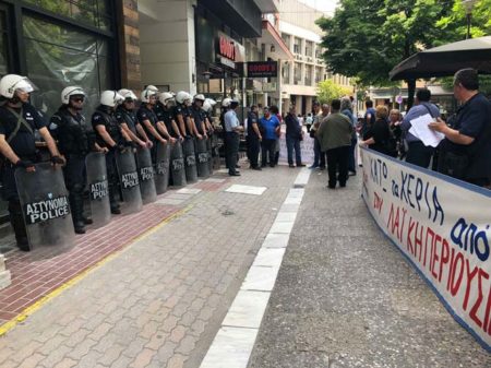 Ισχυρή αστυνομική δύναμη παρατάχθηκε απέναντι στους διαμαρτυρόμενους που ζήτησαν το μεσημέρι της Λάρισας να μην βγει στο σφυρί πρώτη κατοικία Βολιώτη ελεύθερου επαγγγελματία για χρέος προς τράπεζα, ύψους 42.395 ευρώ.