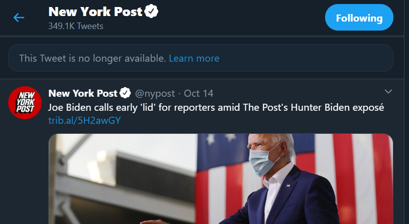 "Όποιος κοιτάζει τη ροή Twitter της Post δεν μπορεί καν να δει τα tweets σχετικά με τις ιστορίες του Biden, τα οποία έχουν αντικατασταθεί από μηνύματα που λένε," Αυτό το Tweet δεν είναι πλέον διαθέσιμο ", έγραψε η Post την Παρασκευή.