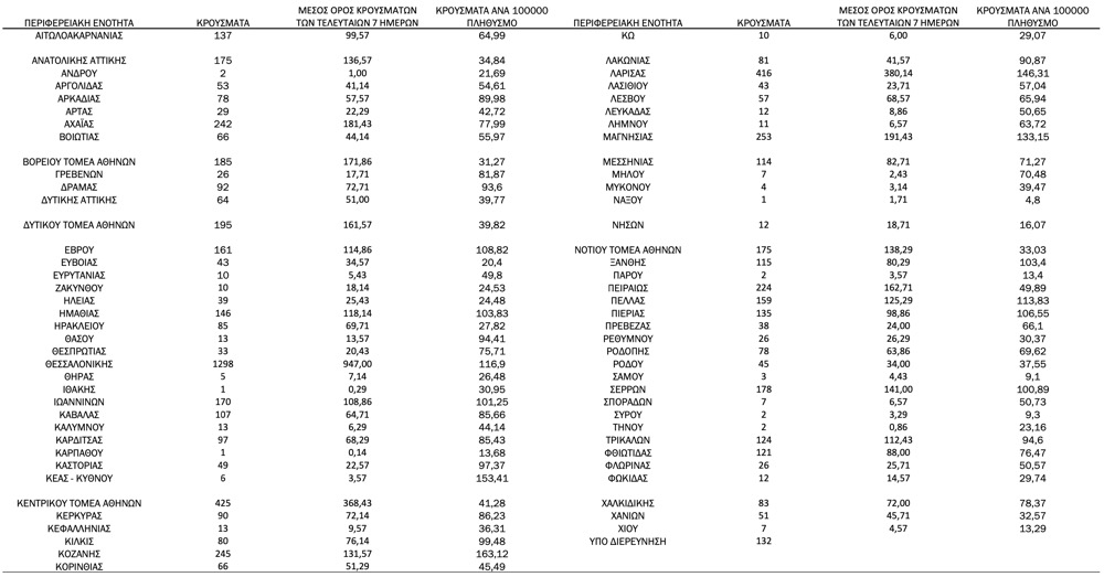 Νέο αρνητικό ρεκόρ κρουσμάτων από την έναρξη της πανδημίας ανακοίνωσε σήμερα ο ΕΟΔΥ. Τα νέα εργαστηριακά επιβεβαιωμένα κρούσματα της νόσου που καταγράφηκαν τις τελευταίες 24 ώρες είναι 7.335 , εκ των οποίων 17 εντοπίστηκαν κατόπιν ελέγχων στις πύλες εισόδου της χώρας. Στη Λάρισα τα νέα κρούσματα ανήλθαν σε 416.