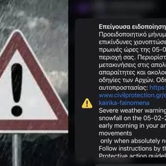 Το μήνυμα που έφτασε λίγο μετά τις 15:00 στα κινητά τηλέφωνα των πολιτών αναφέρει χαρακτηριστικά: «Μήνυμα για επικίνδυνες χιονοπτώσεις στην περιοχή σας. Περιορίστε δραστικά τις μετακινήσεις και ακολουθήστε τις οδηγίες των Αρχών.
