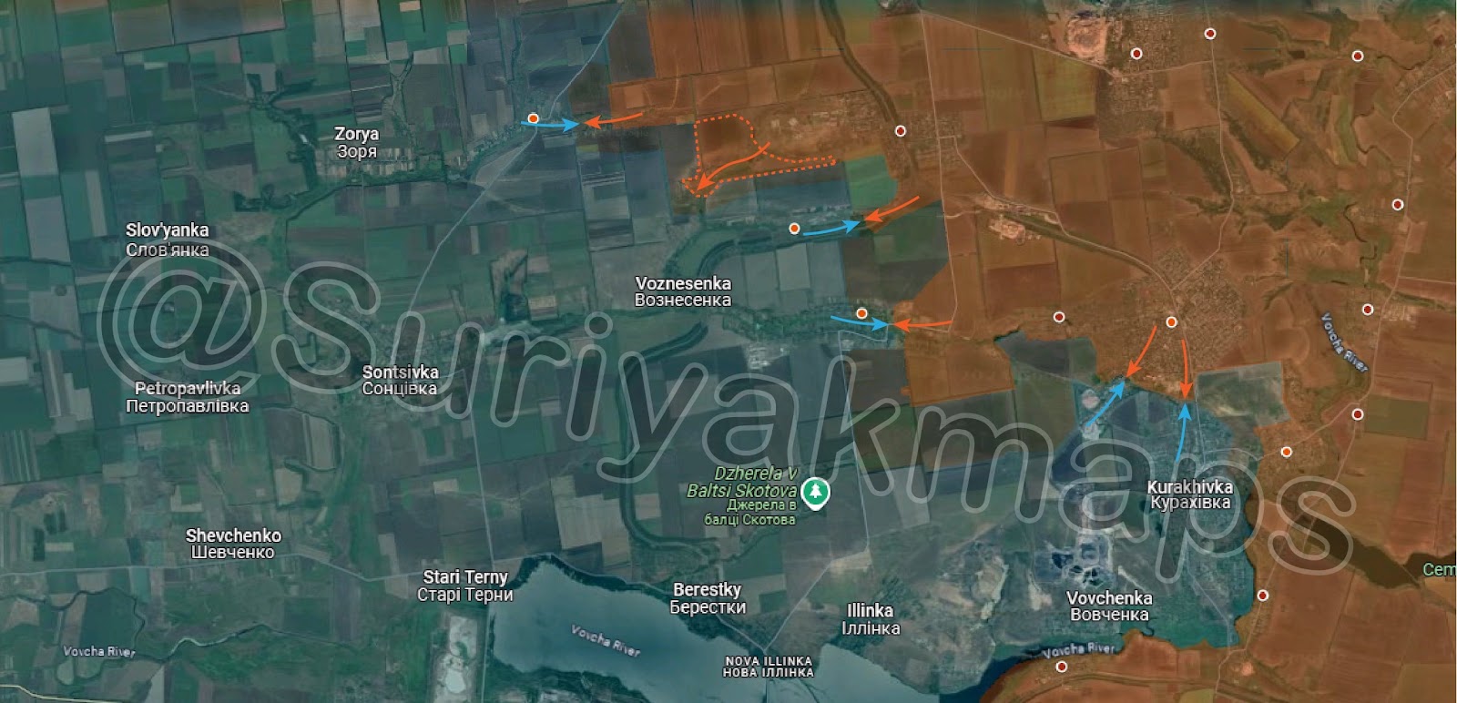 Suriyak Ukrainian-Russian war. Day 976:Situation on Kurakhove front: #RussianArmy advanced southwest of Tsukuryne towards the locality of Voznesenka. Clashes with #UkrainianArmy continue at the axis of Novodmytrivka, Kreminna Balka, Novoselydivka, Gornik & Kurakhivka.Map: [ google.com/maps/d/viewer?… ]